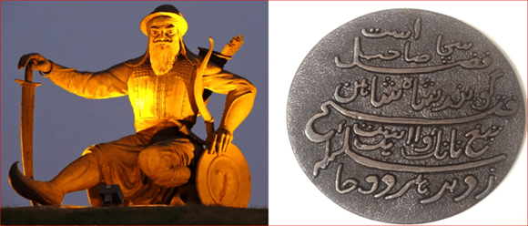 The earliest Sikh coin was issued in 1712 by the first Sikh ruler, Baba Banda Singh Bahadur, (1670-1716), who ruled from 1709 to 1716. He was a valiant Sikh General who captured Wazir Khan, the cruel Governor of Sirhind, the capital of Moghuls in the North India. Wazir Khan had bricked alive the two younger sons of Guru Gobind Singh in 1704 when the brave lads had refused to convert to Islam. The coins were issued in honour of Sikh Gurus and carried the following legends in Persian.