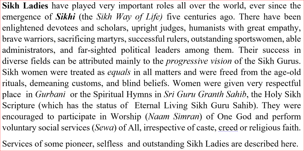 Pioneering Sikh Ladies of Modern Times Posted by Dr. (Prof) Surjit Singh Bhatti on March 30, 2021March 30, 2021 Share this: Share on X (Opens in new window) X Share on Facebook (Opens in new window) Facebook Like Loading... Related Published by Dr. (Prof) Surjit Singh Bhatti View all posts by Dr. (Prof) Surjit Singh Bhatti