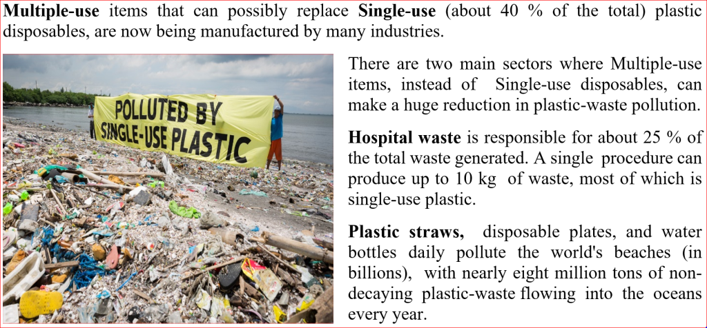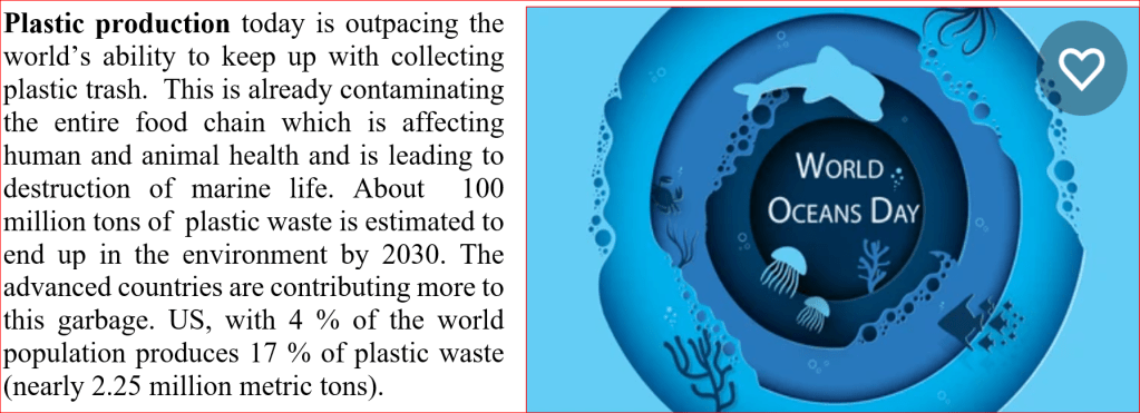 Earth Day celebration (April 22) in 2018 had the theme: ‘End Plastic Pollution’. Up to nine million metric tons of plastic waste enters the oceans each year. All organisms are harmed by entanglement, ingestion and by the chemicals in the plastic waste. Plastics outnumber by 7-to-1 baby fish in coastal ocean slicks that are nurseries for larva. Humans get adverse hormonal changes due to plastics.