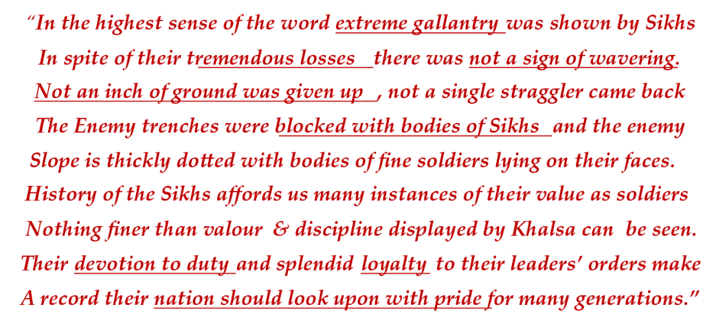 Tributes paid to the Sikh soldiers by General Sir Ian Hamilton are quoted here.
