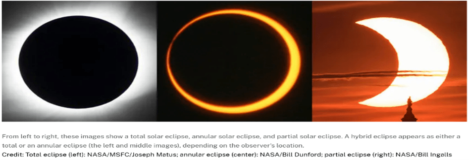 A partial Solar Eclipse happens when the Sun, Moon, and Earth are not perfectly lined up. A crescent- Sun is visible while the rest is covered. During a Total or Annular Solar Eclipse, outside the Moon’s inner shadow, a partial eclipse is visible.